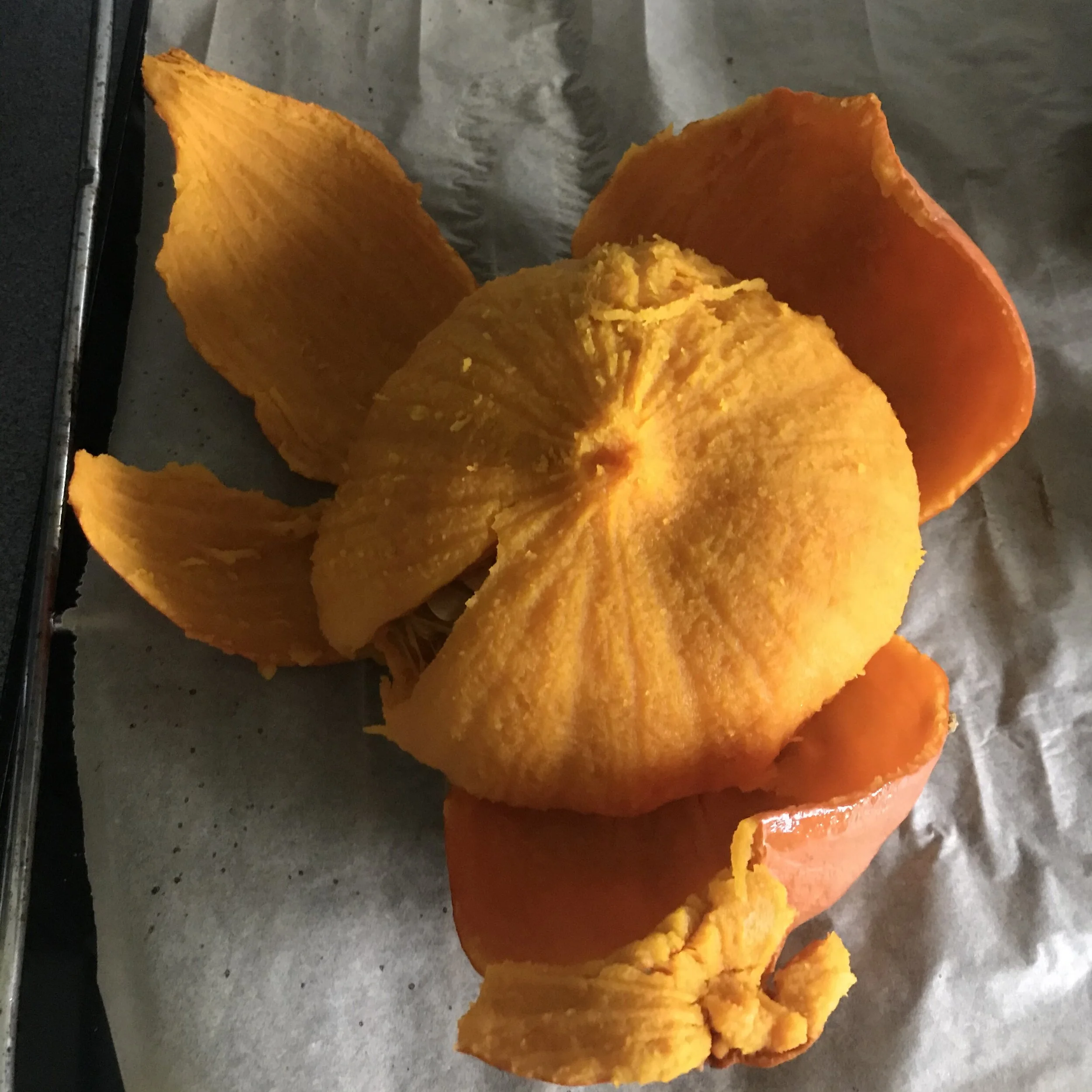 Puedes asar la calabaza entera para pelarla con más facilidad. Como ves, la piel se desprende por sí misma, una maravilla.